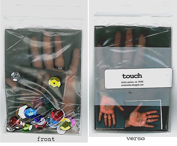First Series: Touch (not editioned) Placed works at end of May, 2010. Consists of transparent xeroxes of my hand - large and small and multi-colored sequins and beads. Verso signifier word sticker with email address. Did you find one? Tell me about it.